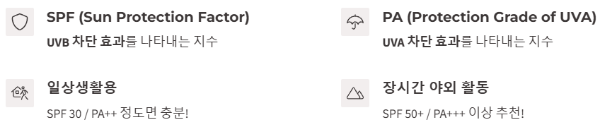 - 장시간 야외 활동: SPF 50+ / PA+++ 이상 추천!