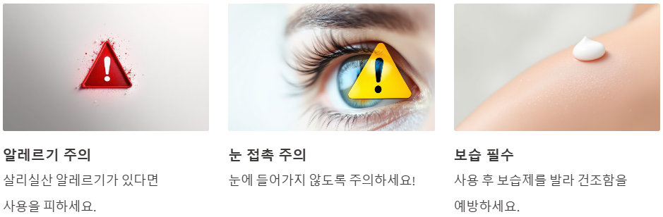 👉 살리실산은 각질 제거 효과가 있어서 피부가 건조할 수 있어요. 세안 후 보습제를 충분히 발라주세요.
