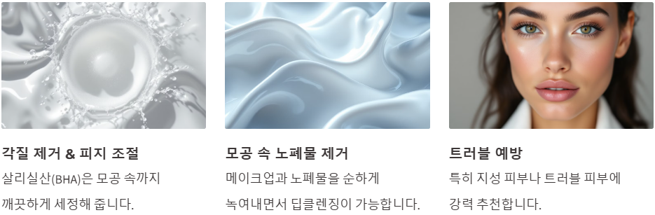 살리실산(BHA)은 모공 속까지 깨끗하게 세정해 주는 성분이에요.
